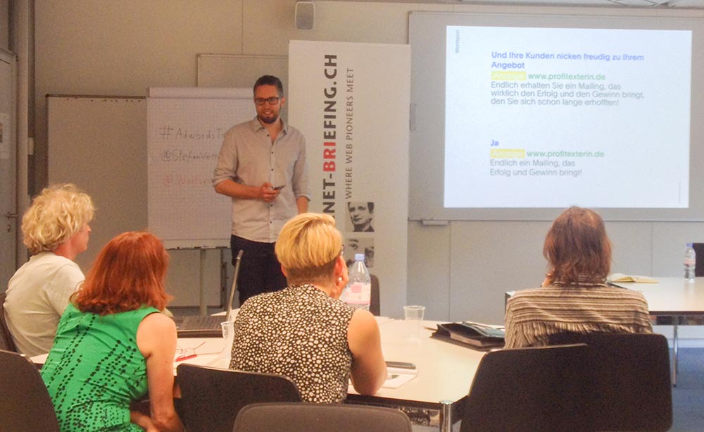 Gestern durfte ich auf Einladung von Reto Hartinger zu diesem Thema ein Referat beim Internet Briefing in Bern halten. In dem Vortrag habe ich fünf Strategien vorgestellt, mit denen sich Anzeigentexte für AdWords optimieren lassen. Jede der Strategien wurde als Workshop anhand praktischer Beispiele vorgestellt, bei denen das Publikum sich intensiv einbringen durfte.